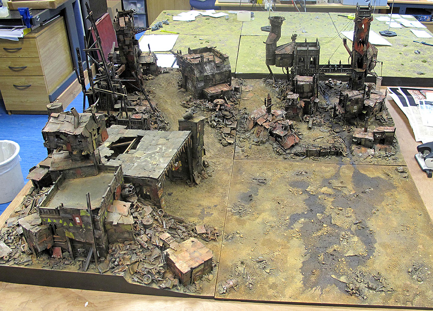 -les zones de cratères (je pense faire plusieurs plaques genre "bombardement orbital" avec des cratères et des débris, parfois un pan de mur seul) assez crades avec pas mal de pigments noirs et des cendres (facile à faire en pigment, une couche de pigments noirs, diluant, une couche de pigment blanc, diluant, on répète l'opération autant qu'on veut et on a des cendres crédibles).